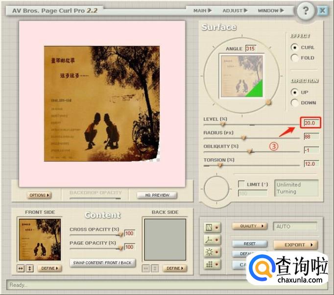 安装好以后接着刚才的步骤,选择最上面的“01副本4”图层然后点击"滤镜"-"AV Bros.page curl",在该插件里面我们只需设置"level"这一项即可,初始可以设置为20,如下图