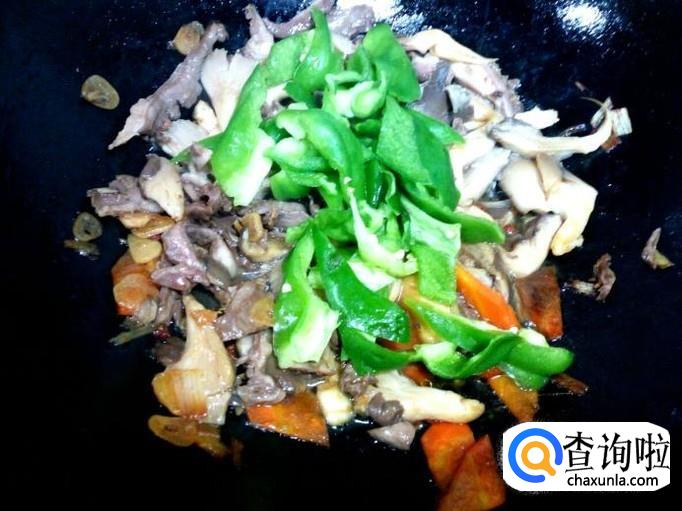 炒至鲜蘑变软,放入青椒翻炒。青椒略翻炒一下,放入味精,关火出勺。
