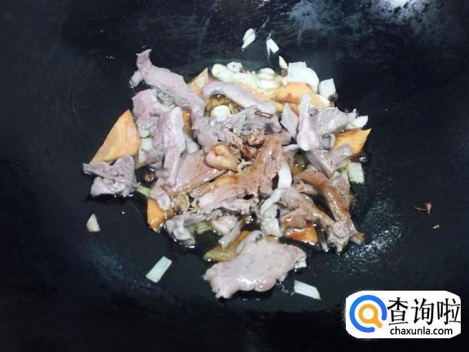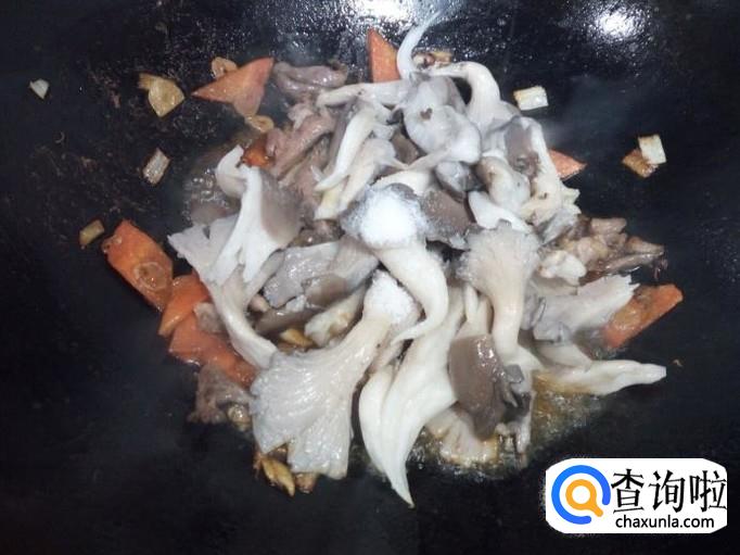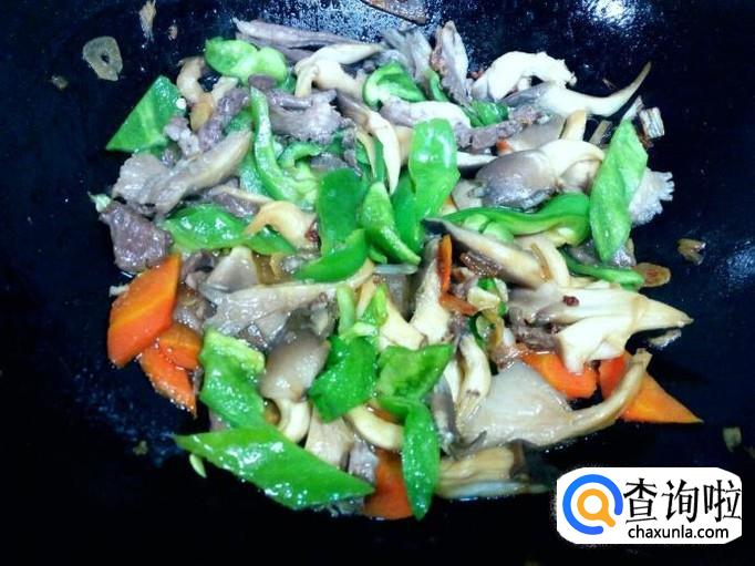 炒至胡萝卜片变软,放入猪心翻炒,放入料酒,酱油。猪心略翻炒一下,放入鲜蘑翻炒,放入盐。