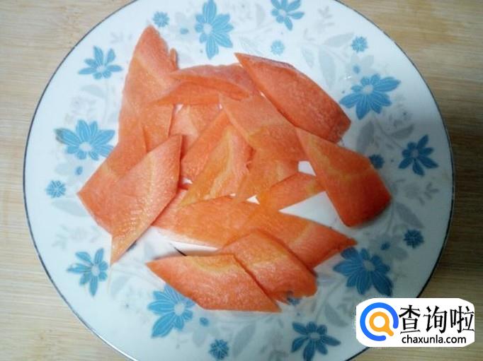 胡萝卜去皮,用水清洗干净,控干水分,切成片。切好葱,姜,蒜备用。