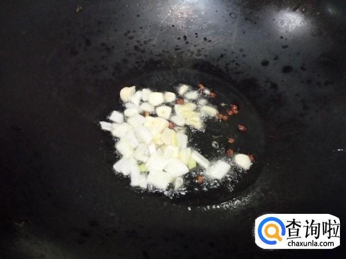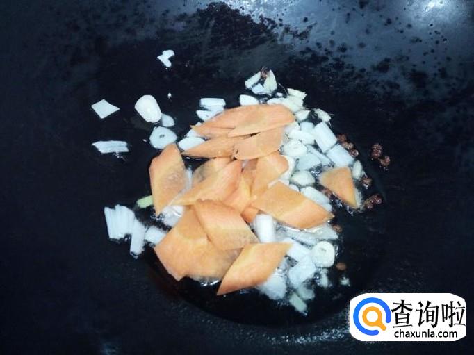 锅里放入油加热,油热后放入花椒,葱,姜,蒜,爆锅。放入胡萝卜片翻炒。