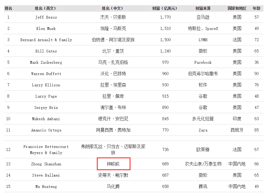 从2021福布斯全球富豪榜来看,截至2021年6月,中国首富是钟睒睒,财富689亿美元,财富来源为农夫山泉/万泰生物,位列榜单第13位。