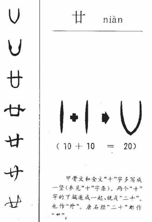 “廿”字是将两个十连在一起,表示二十。这是古文字中常见的合文,即将两个或三个字合写在一起,或上下相连,或左右相拼,或内外包容,或上下左右排在一起。