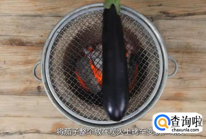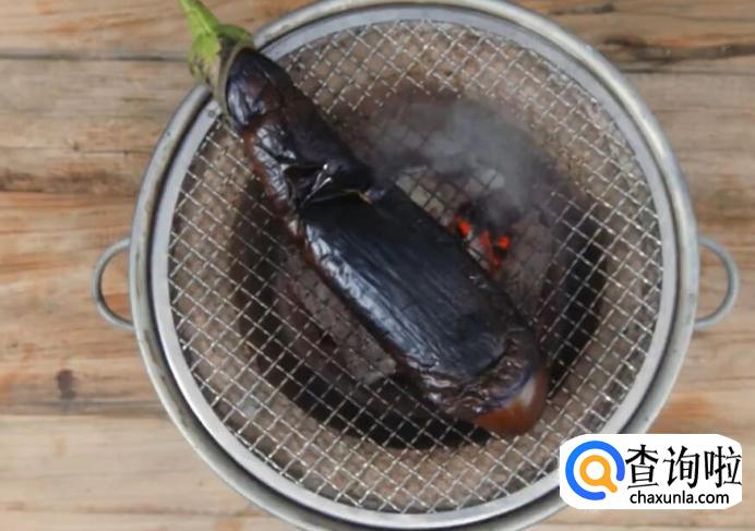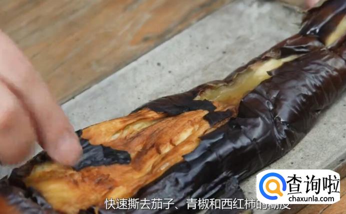 趁还有凉透的时候,快速撕去茄子、青椒和西红柿的糊皮。