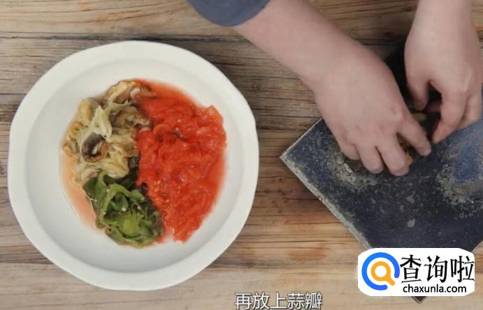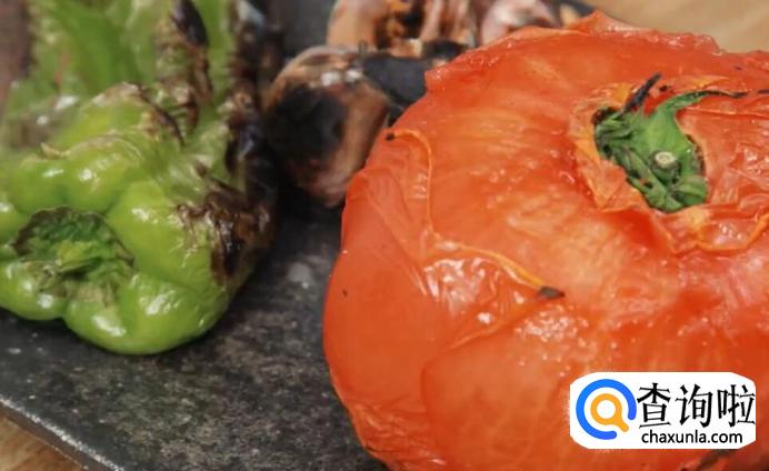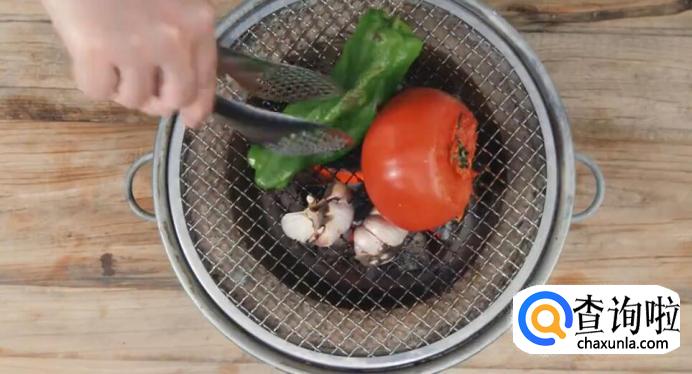 接着烤青椒、西红柿和红皮蒜头,直到外皮稍微焦糊、起皱就好了。