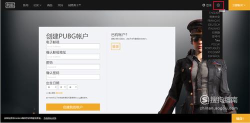下载游戏前我们先使用邮箱注册到游戏账号,因为系统默认的文字不是中文所以我们点击右上角地球可以选择中文。