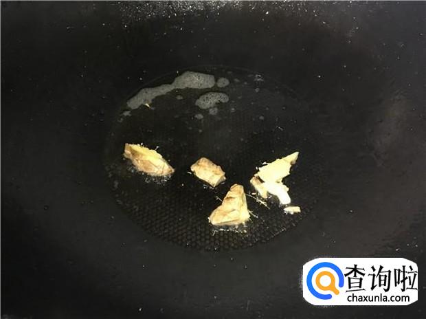 热锅下油,放入姜片煸香,然后倒入鸭肉,翻炒均匀。