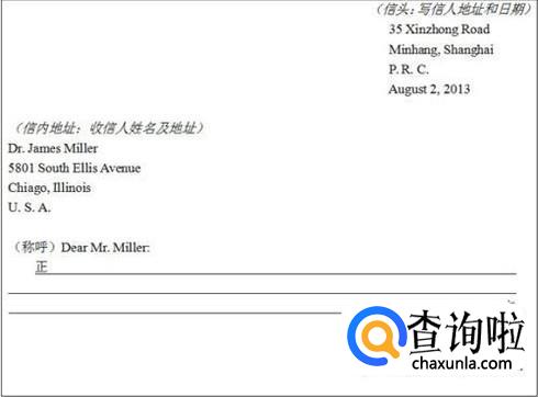 英文信件一般会将写信人的地址和日期写在信件的右上角。而收件人的地址,姓名和其他信息则写在左侧靠下部分,如下图所示。