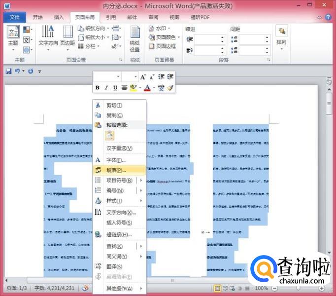全选的状态下,单击右键,在弹出的对话框中,找到“段落”或者直接在“开始”选项卡里面找到“段落”也是一样的。