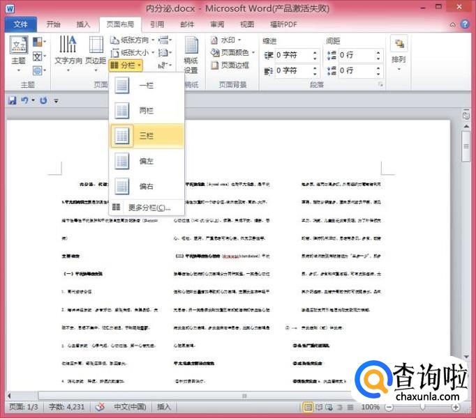 我们设置三栏,选择“三栏”即可(这时,我们的文档还有三页)