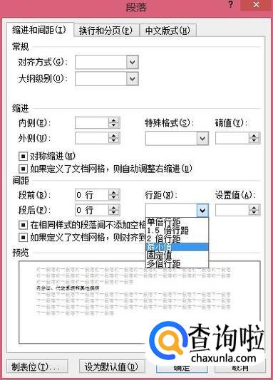 将段前、段后距都设为“0行”,行间距设置为最小值