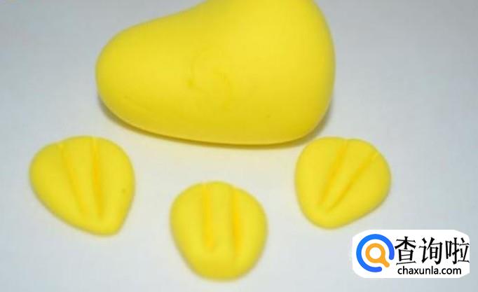 用黄色的粘土捏成爪子的形状,作为青蛙的爪子;然后再用绿色的捏成四个条状作为青蛙的手臂和腿。
