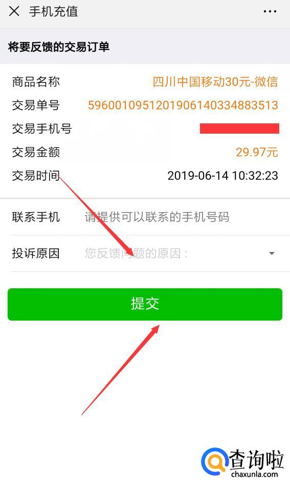 然后输入联系手机再选择投诉原因,提交之后提交想要充值的号码就可以充值到自己想充值的号码了。