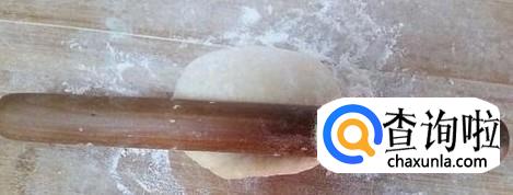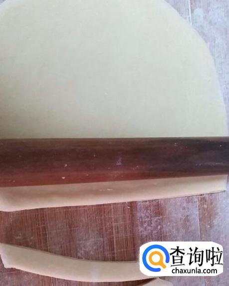面团醒好后放在案板上,用擀面杖擀成面饼,厚度要均匀。