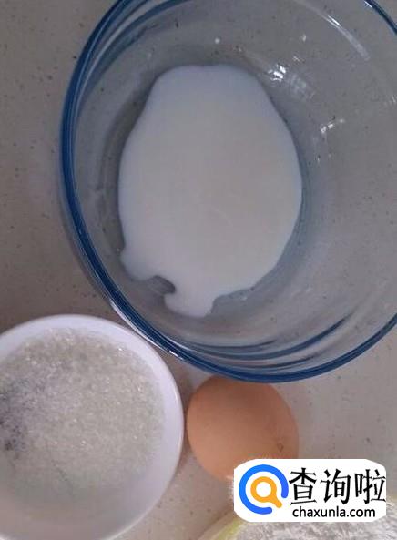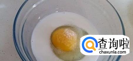 将鸡蛋打入到盛奶的碗中,将白糖倒入奶中。