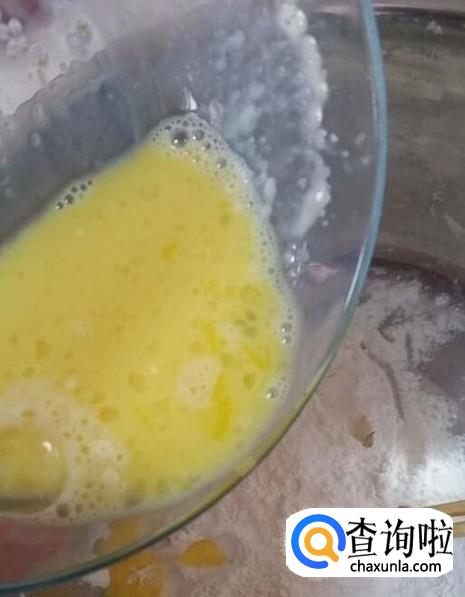 将蛋奶混合液倒入面粉中,均匀的和面。
