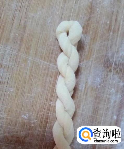 拿起细条。一手拿一头向相反的方向拧,一直拧然后对折,会交缠在一起。