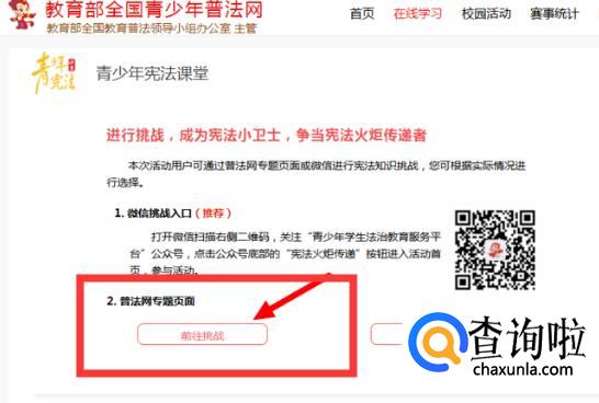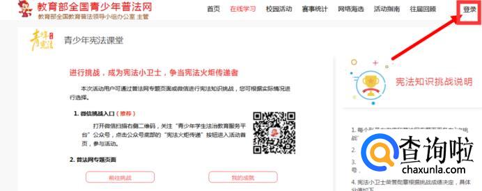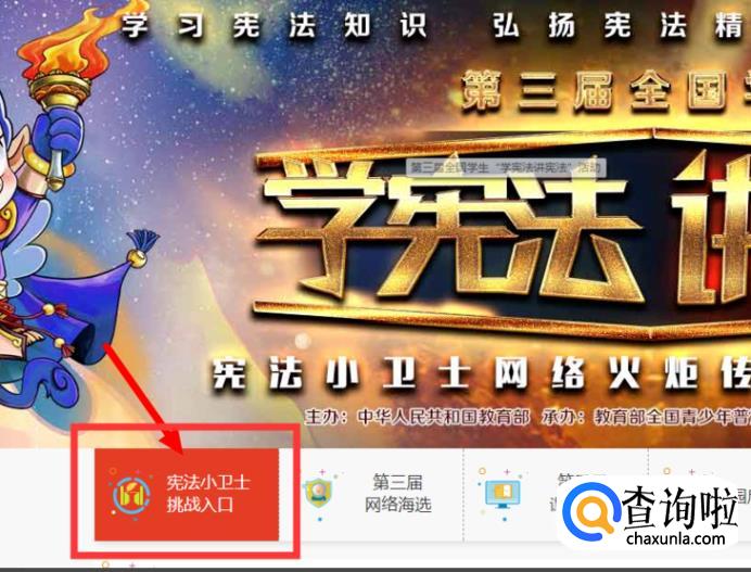 点开宪法活动,进入考试专题页面,点击右上角“宪法小卫士挑战入口”进入挑战的页面。