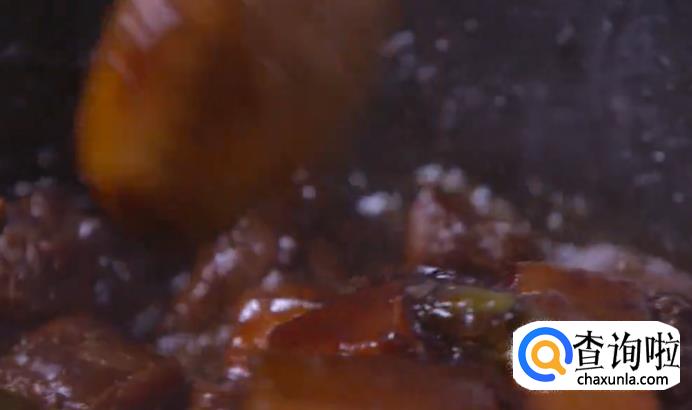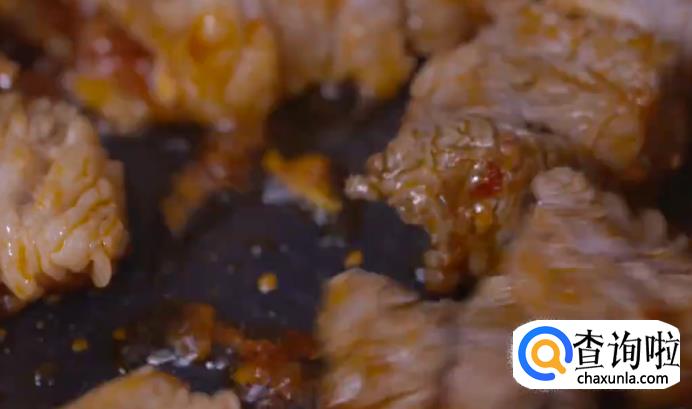 将油烧热之后入油,下姜片、蒜、豆瓣酱爆香,再放入牛腩块翻炒,均匀裹上酱料即可。