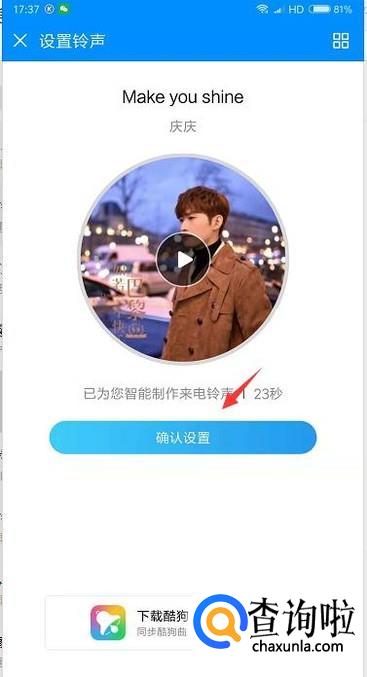 然后酷狗系统会自动截取歌曲的高潮部分作为铃声,我们点击下方的立即设置。