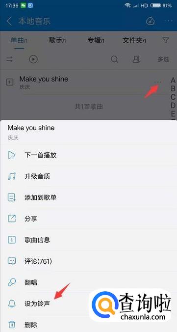 打开酷狗音乐后找到我们想要设置铃声的歌曲,点击右上角的三个小圆点,接着会出现很多选项,选择设置为铃声即可。