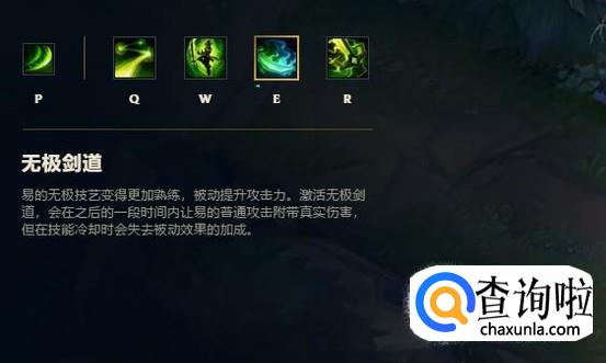 e技能:无极剑道,开启后可以提升攻击力并附带真实伤害,开启e技能后打人很疼。
