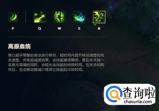 r技能:高原血统,大幅度的提升剑圣的移动和攻击速度,击杀或者助攻后还可以刷新,也是剑圣被称为“疯狗”的原因。