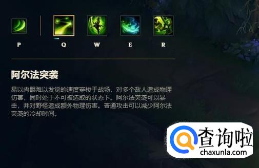 q技能:阿尔法突袭,指向性技能,能对选中的目标和其旁边的单位造成伤害,而且在发动技能时无法被选中,用好了能躲很多技能。