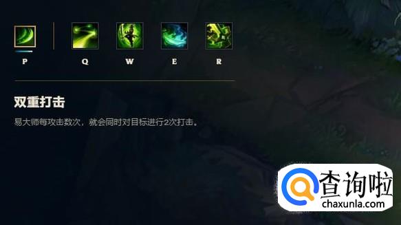 被动技能:双重打击,剑圣每几次普通攻击后,就会有一次普通攻击进行两次打击,在剑圣的攻速叠加起来之后就会经常触发,伤害很高。