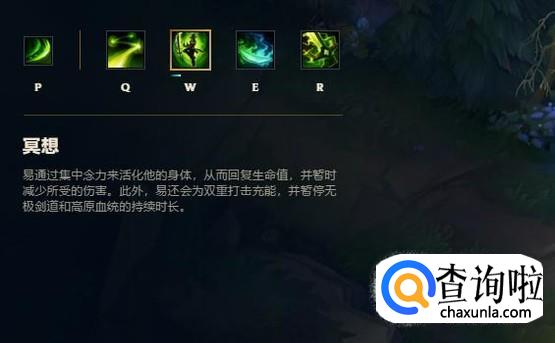 w级技能:冥想,很强势的减伤技能,剑圣能够越塔强杀的保障,减伤配合回血,非常有用。