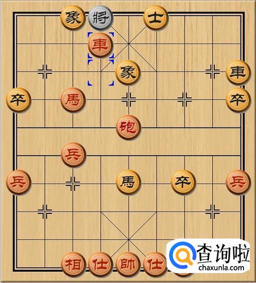 黑方车1平4,黑方左路车紧急支援,黑方车走到黑方老将前面,以黑方老将为后盾,挡住了红方车的将军。如图所示。