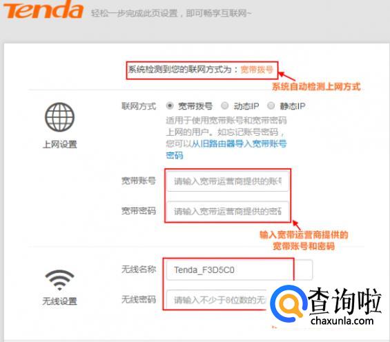 选择上网方式:路由器系统会自动检测你的上网方式,本路由器就是是宽带拨号上网。设置相你的宽带账号和密码,设置wifi名称和密码,点击“确定”就设置完成了。