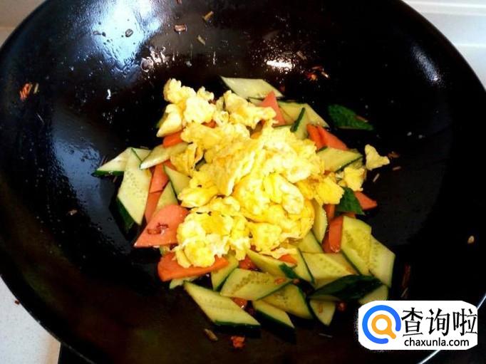 黄瓜炒至断生,放入炒好的鸡蛋,稍翻炒一下,放入少许味精,关火出勺。