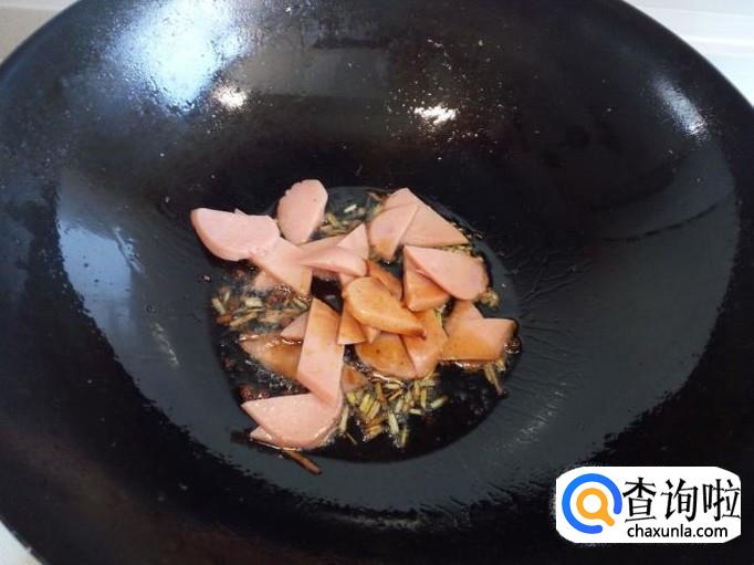 锅内放入油加热,油热后放入花椒,葱,姜,爆香。放入火腿肠小火翻炒,放入料酒,少许酱油。