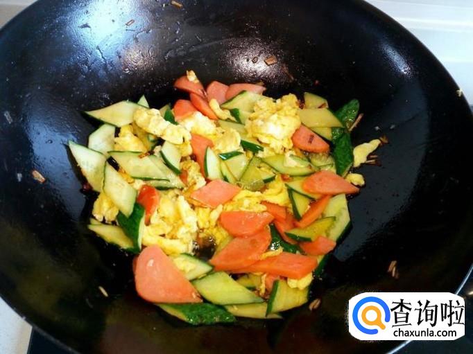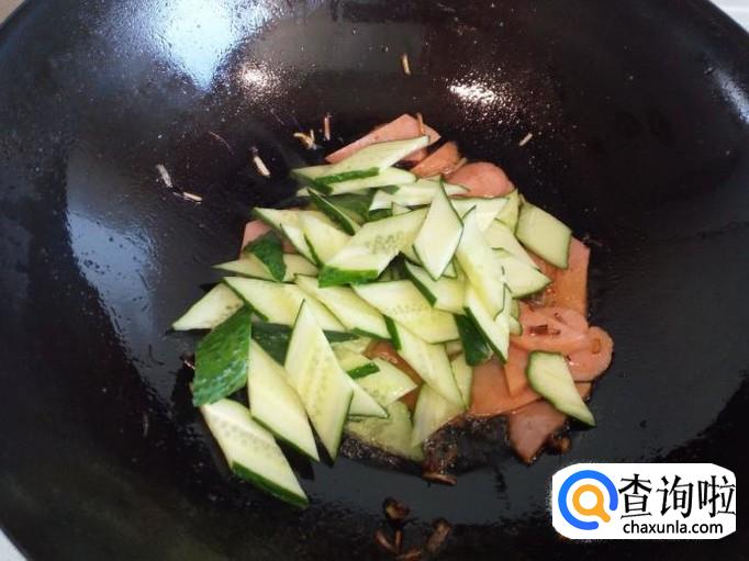火腿肠略翻炒一下,放入黄瓜,转大火快速翻炒,放入盐。