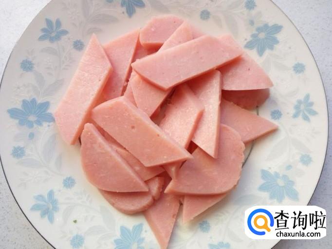 火腿肠去掉外包装,用刀切成0.3公分左右厚的片。