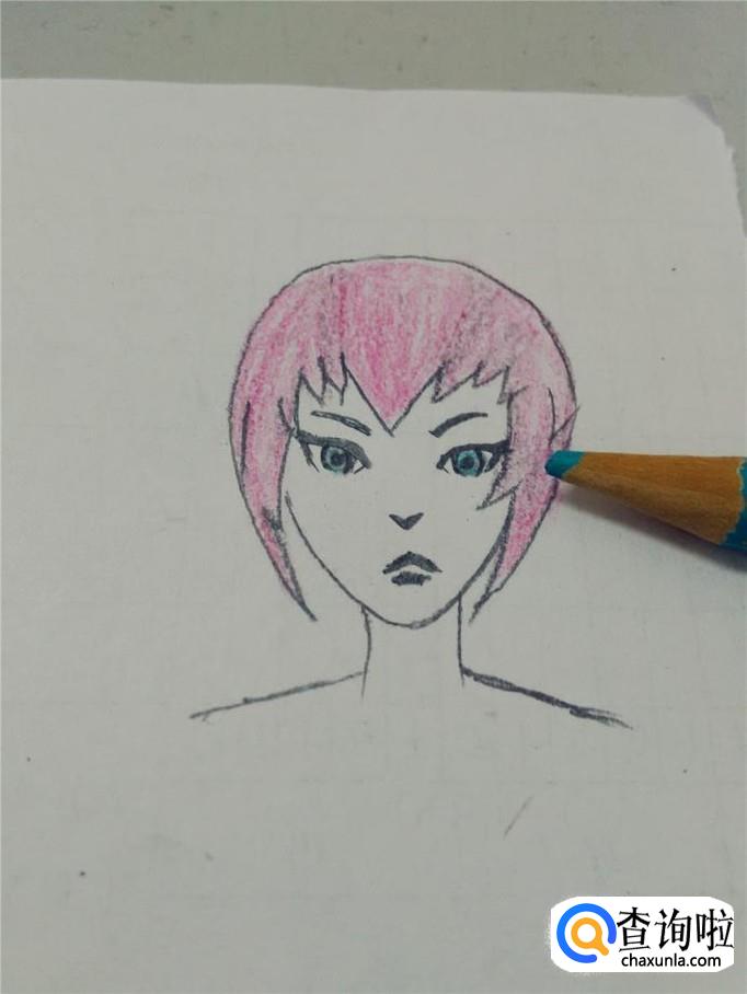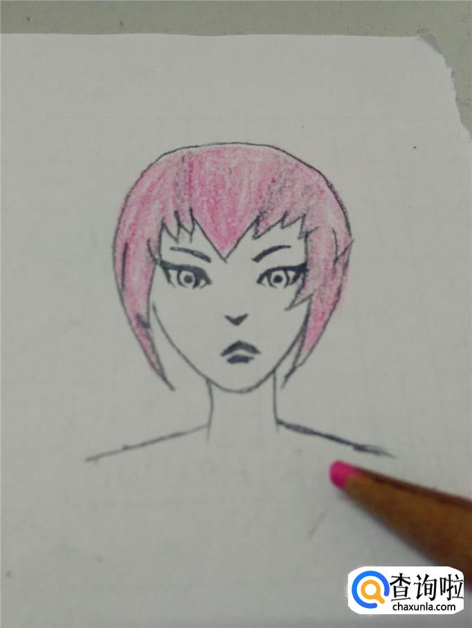 涂色时,漫画人物的头发可以涂成黑的,但大多数时候,都涂成彩色的,这里用深粉色涂头发。