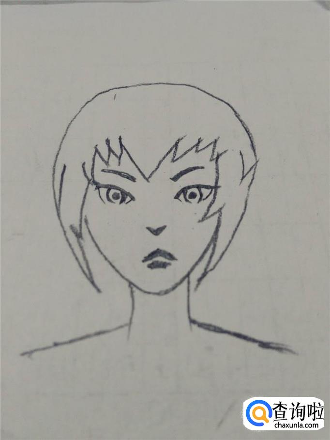 漫画人物的脖子一般都是比较细的,所以,在头下面画出细细的脖子和瘦削的肩膀。