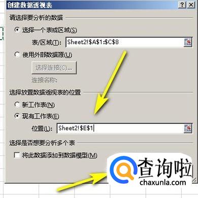 弹出数据透视表的设置对话框,再设置E1为放数据透视表的位置。再点确定。