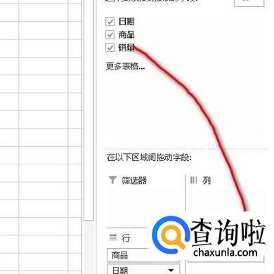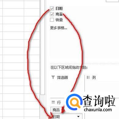点确定后,在工作表右侧弹出一个窗口,把商品字段拉到行这里,再把日期字段拉到行这里,如图所示。