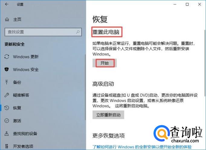 弹出的界面,我们点击重置此电脑中的开始;