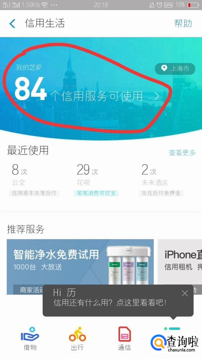 点击“84个信用服务可使用”字样,如下图红色标注地方。
