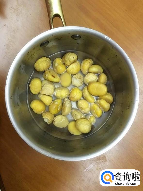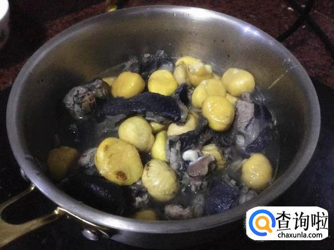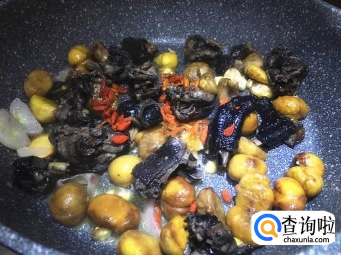锅中倒入少许油,倒入乌骨鸡翻炒后加入栗子,倒入适量清水煮一会