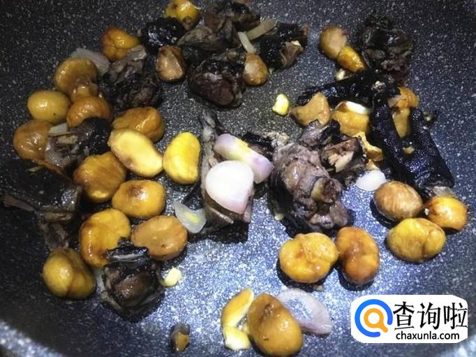 锅中倒入少许油,放入葱头爆香,再把鸡肉和栗子倒入一起翻炒至干