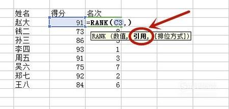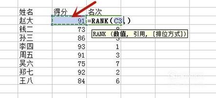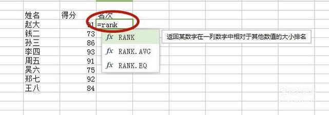 进入Excel表格,选择排名那一列第一行,输入“=rank”,选择自动弹出的第一个函数。