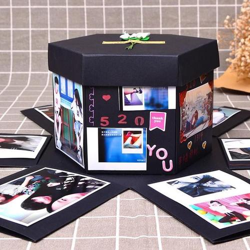 爆炸盒子是某个社交软件上非常火的礼物,它的特点在于将盒子盖子掀开后,它会“爆炸”,绽放出两人甜蜜的合照,中间还有一个小盒子可以放别的小礼物,这个盒子非常简单,但是礼轻情意重,上面是属于两人的回忆,一定能让老婆感动。