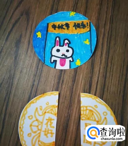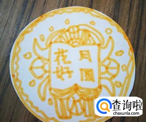 拿出另一张圆纸片,画成月饼的样子,中间是“花好月圆”字样。