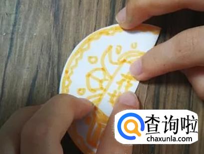 把月饼叠放到第一张圆纸片上,用订书机钉好。