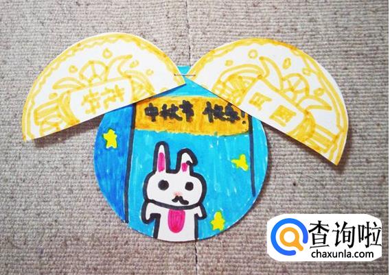 用水笔在一张圆纸片上画出兔子,写上“中秋节快乐”。当然,你也可以按照自己的想法随意创作。