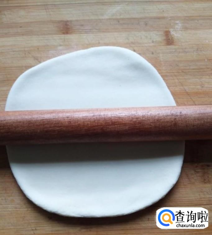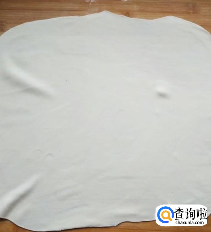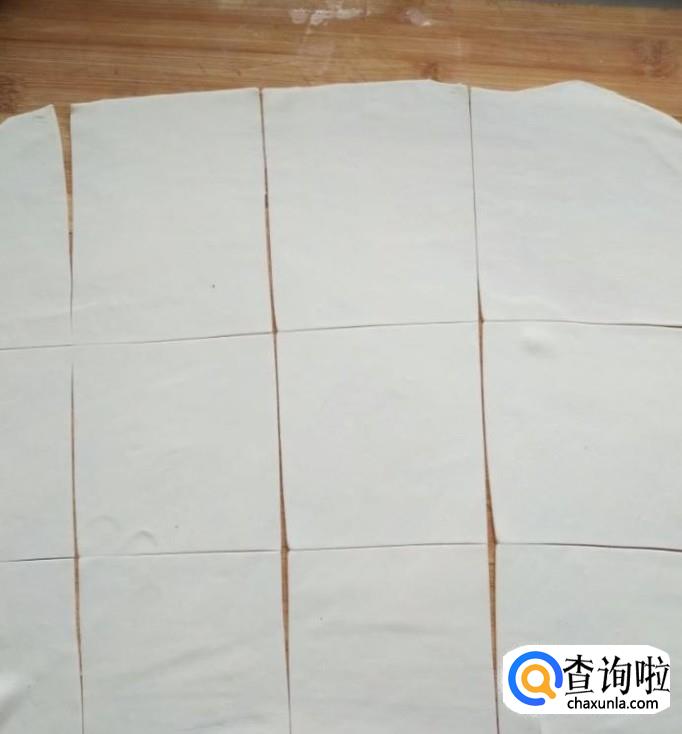然后我们用擀面杖把面团擀成大薄片,用刀切成块